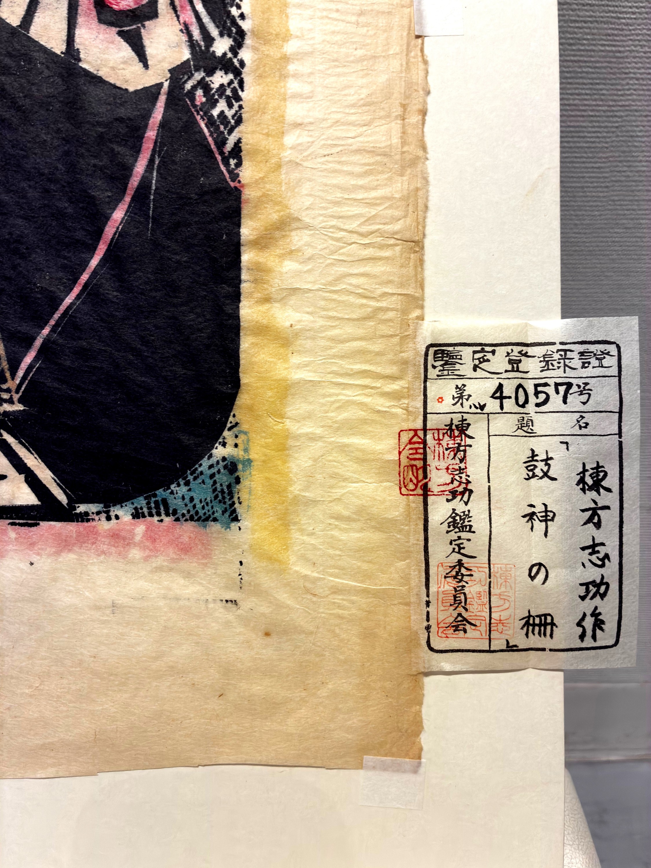 本作は、太鼓を打ち鳴らす神の姿をダイナミックに捉えた、非常に力強い作品です。墨の深い黒と、目に鮮やかな黄色や紅色のコントラストは、飾るだけでその場の空気を一変させる力を持っています。
