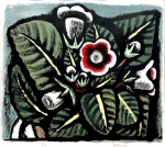 画面から溢れ出すのは、植物が持つ根源的な生命のエネルギーそのものです。北川の代名詞ともいえる、黒く、力強く、そして躍動する輪郭線。それは単に形をなぞる線ではなく、対象の内なる生命のリズムを捉え、刻みつけた痕跡といえるでしょう。大胆にデフォルメされた葉や蕾は、メキシコの乾いた大地と灼熱の太陽を吸収し、野性的なまでの力強さを獲得しています。