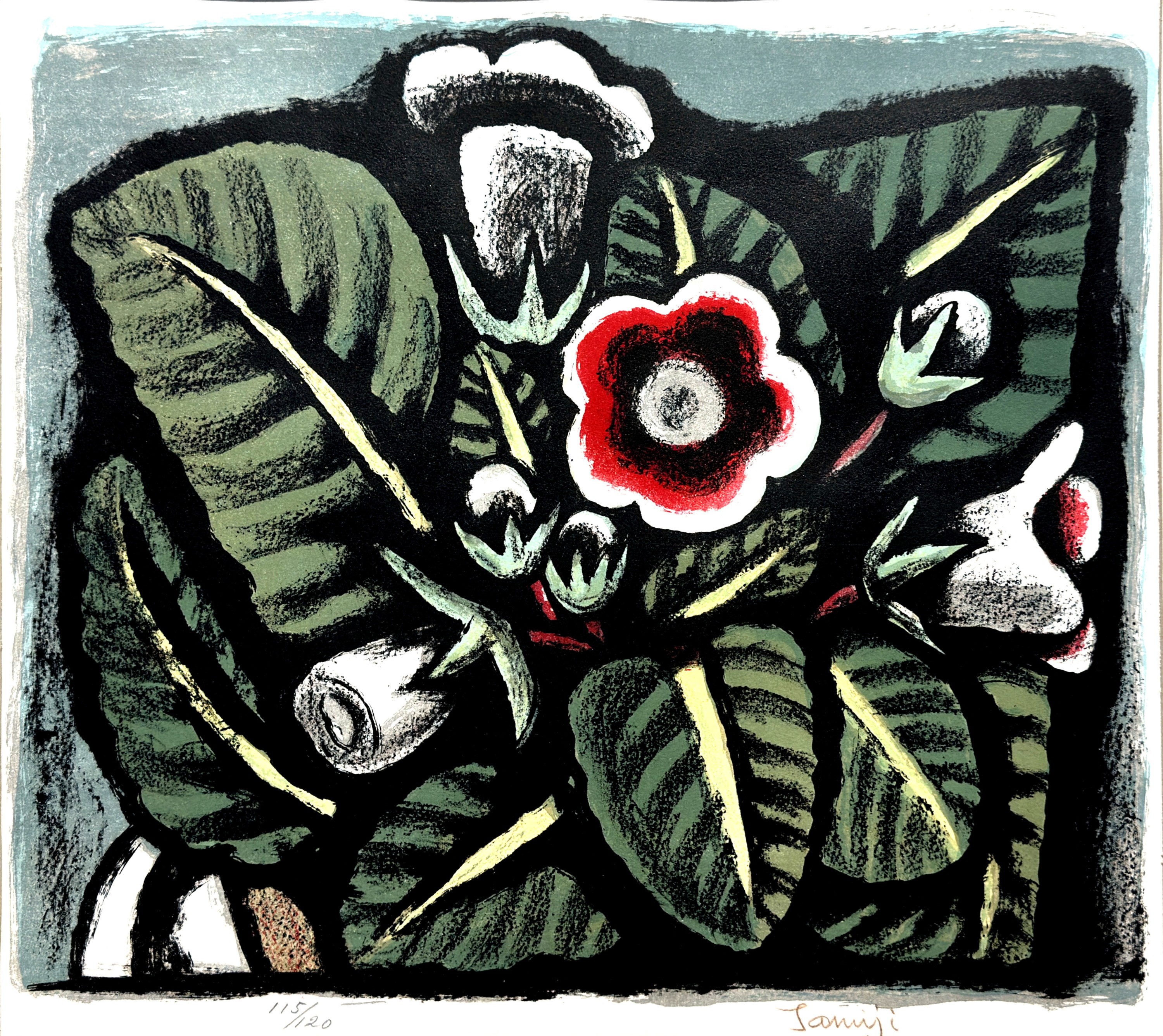 北川民治は、若き日にメキシコへ渡り、リベラやシケイロスら壁画運動の巨匠たちと交流しました。 この作品にも、彼がメキシコの風土と人々から受けた深い影響、その「太陽と土の匂い」が色濃く反映されています。民衆のたくましい生き様への共感と、社会への鋭い眼差しを内に秘めたその作風は、この「グロキシニア」においても健在です。