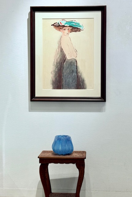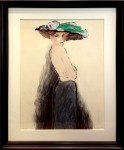 大胆な筆致で描かれた緑色の帽子、そしてアクセントとなるターコイズのピアスが、彼女の強い存在感を際立たせます。余白をたっぷりと取った構図が、見る者の想像力をかき立て、描かれた女性の物語へと誘います。その愁いを帯びた眼差しは、一度見たら忘れられないほどの引力を持っています。