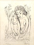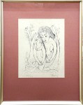 モノクロームで表現された本作は、北川民治の「描線」の魅力を余すところなく伝えています。人物の柔らかな輪郭、髪の毛の繊細な流れ、そして植物の有機的なフォルム。その全てが、澱みなく、かつリズミカルな一本の線で結ばれています。単純化(デフォルメ)された形態は、プリミティブアートのような素朴さと、洗練されたモダンな感覚を同時に感じさせ、画家の類稀なるデッサン力を証明しています。