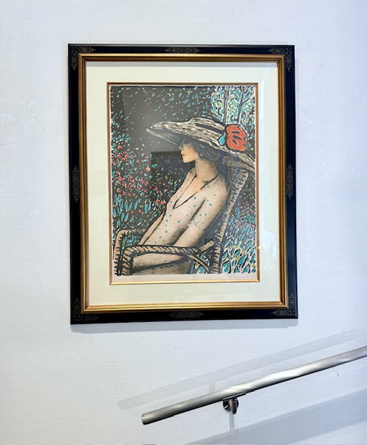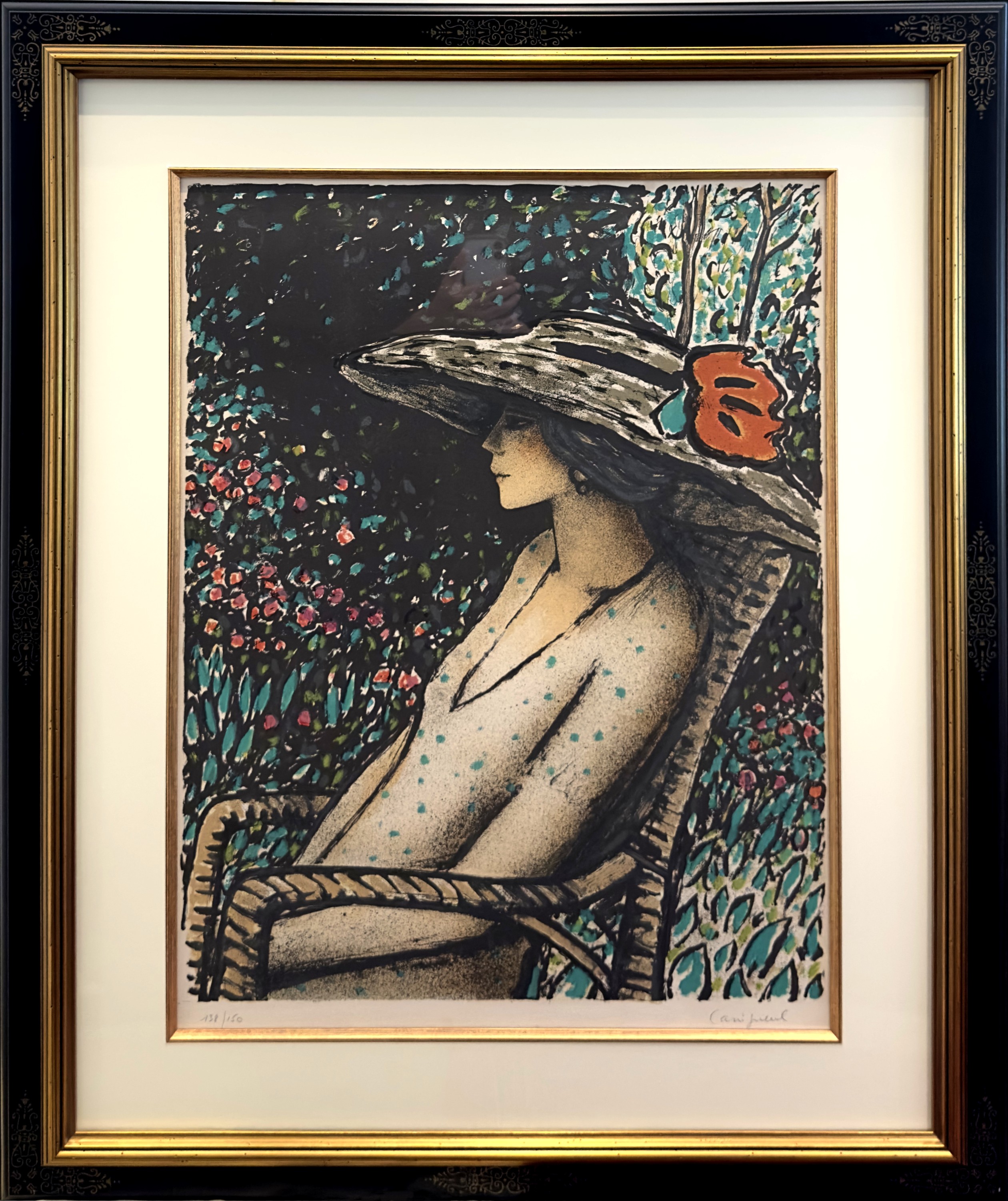 深い闇のような黒が、ターコイズグリーンの葉や帽子にあしらわれたオレンジ色の花の鮮やかさを際立たせ、観る者を惹きつけます。洗練されたモダンな魅力が薫る、貴重なエディションナンバー入りのリトグラフです。
