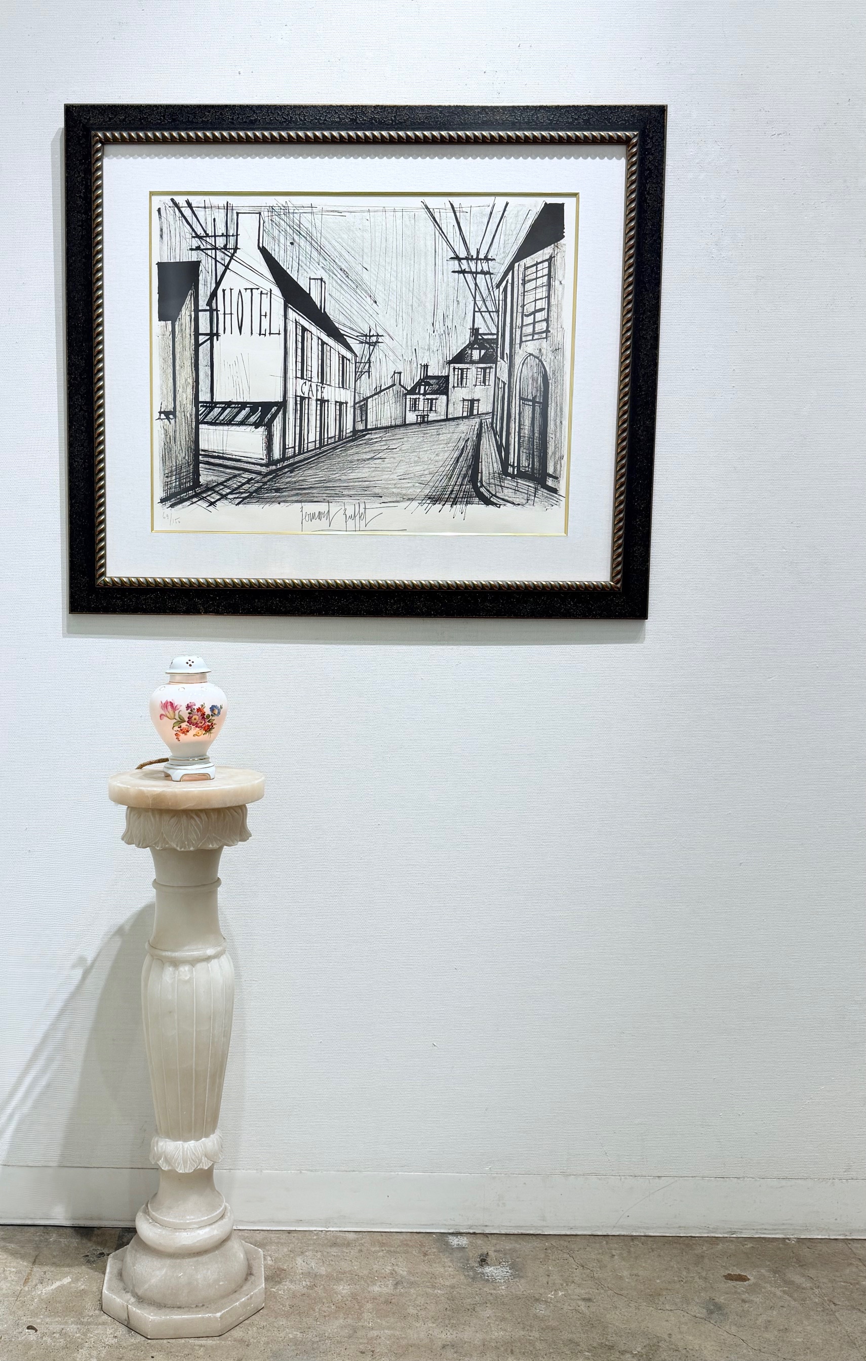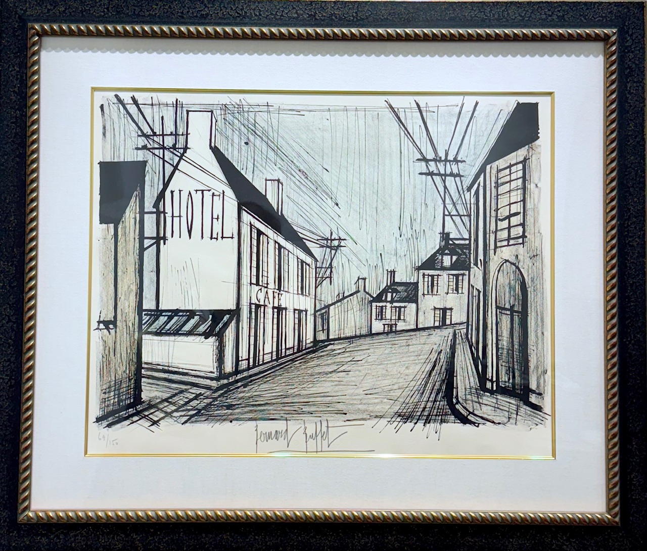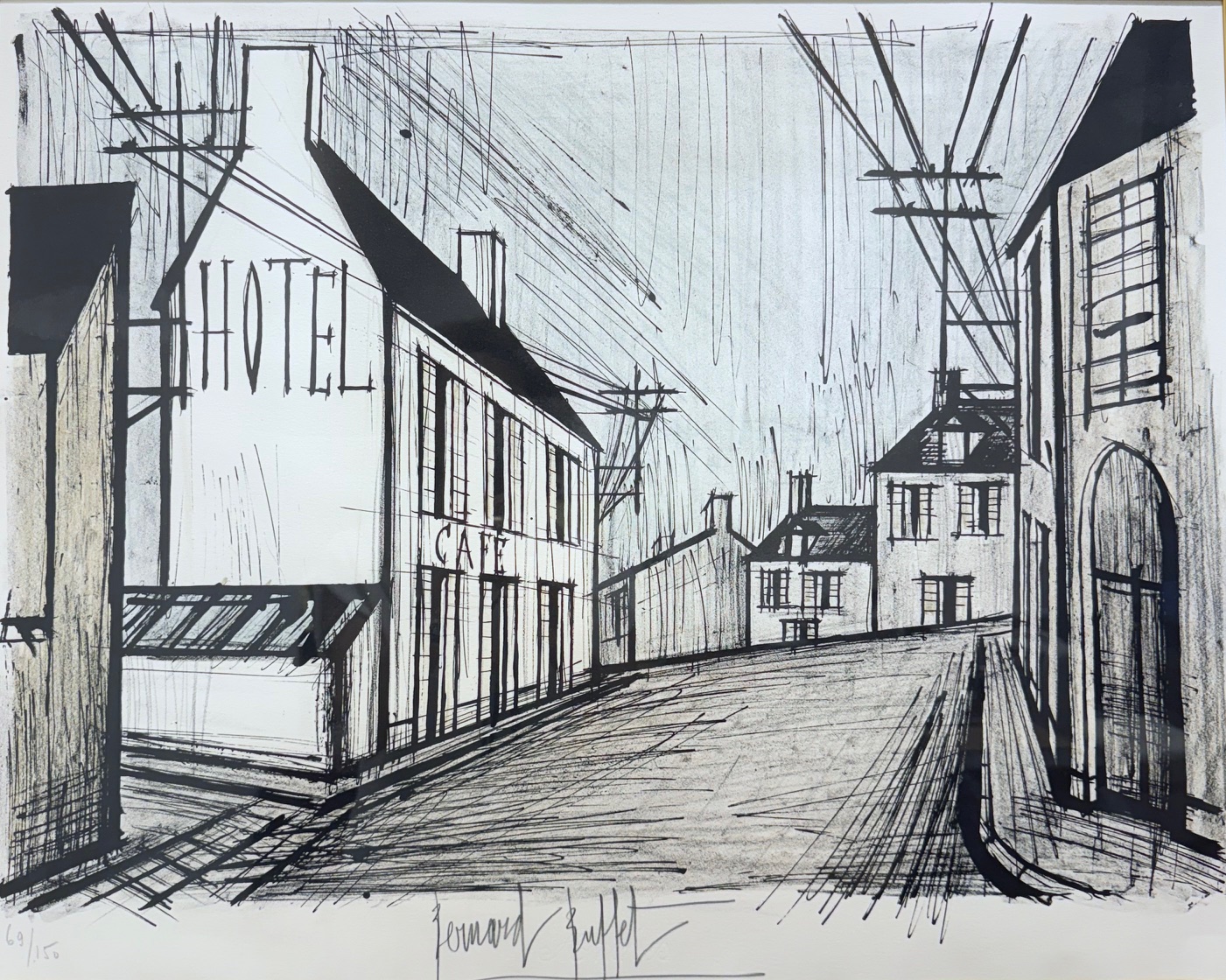 鋭い線とモノクロームの階調で独自の様式を確立したビュッフェは、1969年に制作されたこの『村の風景(PAYSAGE DE VILLAGE)』においても、その特徴的な画風を遺憾なく発揮しています。鋭い線描で描き出された家々や電線は、画面全体に緊張感と詩情を与え、見る者を独特の世界へと引き込みます。