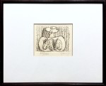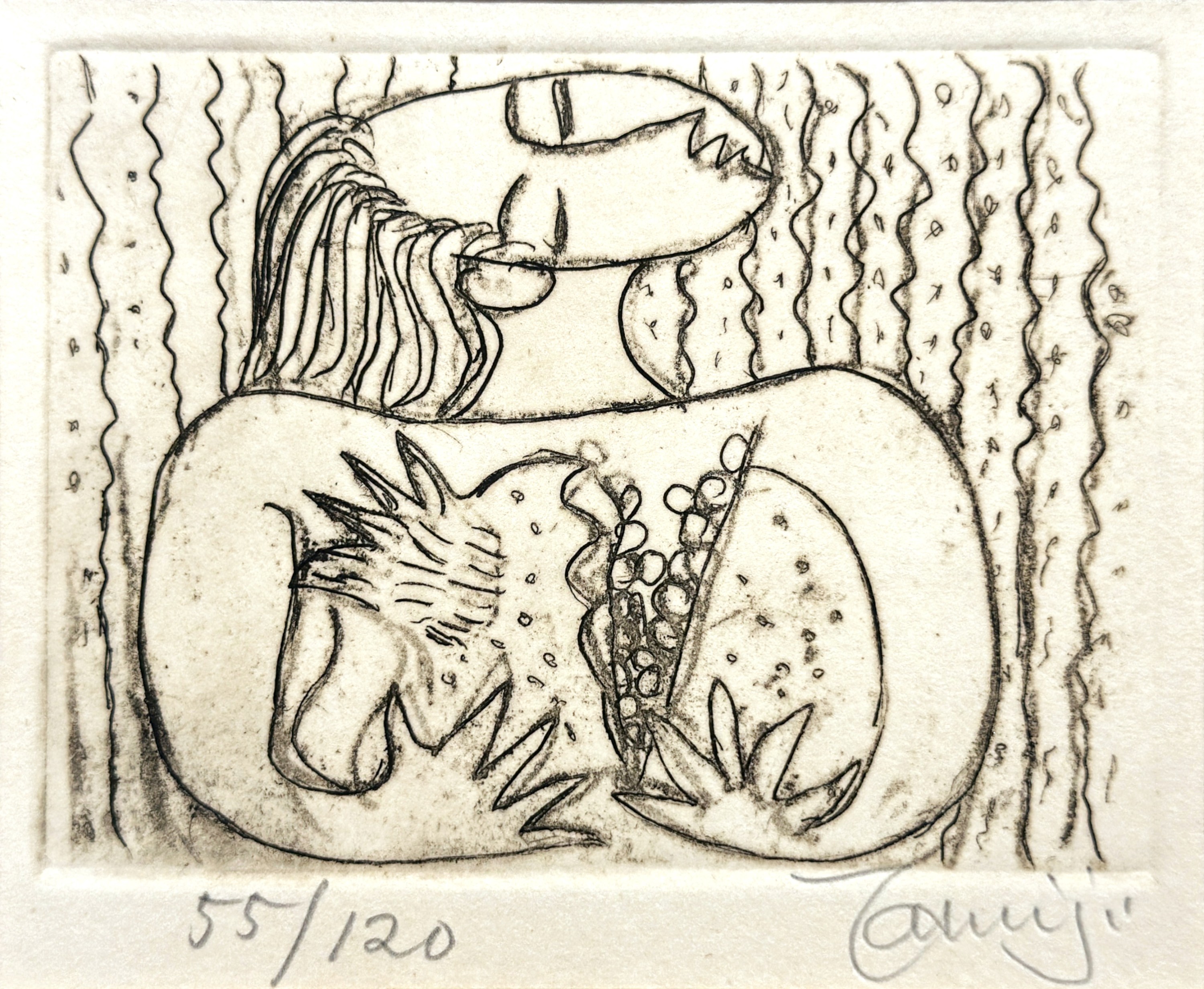 絵寸は9.5×12cmという小ぶりなサイズながら、その画面からは豊かな物語が香り立ちます。モノクロームの版画であるからこそ、作家の描く線の力強さ、そしてモチーフ一つひとつのフォルムが際立ち、想像力をかきたてられます。背景に刻まれたリズミカルな曲線は、まるで生命のざわめきのようにも、あるいはメキシコの陽気な音楽のようにも感じられ、作品に深い奥行きを与えています。