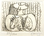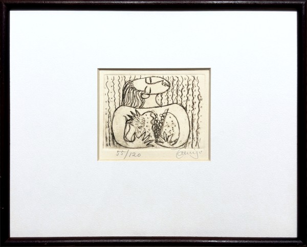 20代でアメリカへ渡り、その後メキシコで約15年にわたり活動した北川民治。 現地では、革命後の壁画運動の熱気の中で、ディエゴ・リベラやフリーダ・カーロといった芸術家たちとも交流しました。彼の作品に一貫して流れるのは、メキシコの先住民や市井の人々への共感と、たくましく生きる生命への讃歌です。 本作に描かれた、ふくよかな女性が鳥と果実を慈しむように抱く姿は、まさにその象徴と言えるでしょう。太く、躍動感あふれる輪郭線と、大胆なデフォルメは北川作品の大きな特徴であり、観る者に強烈な印象を与えます。