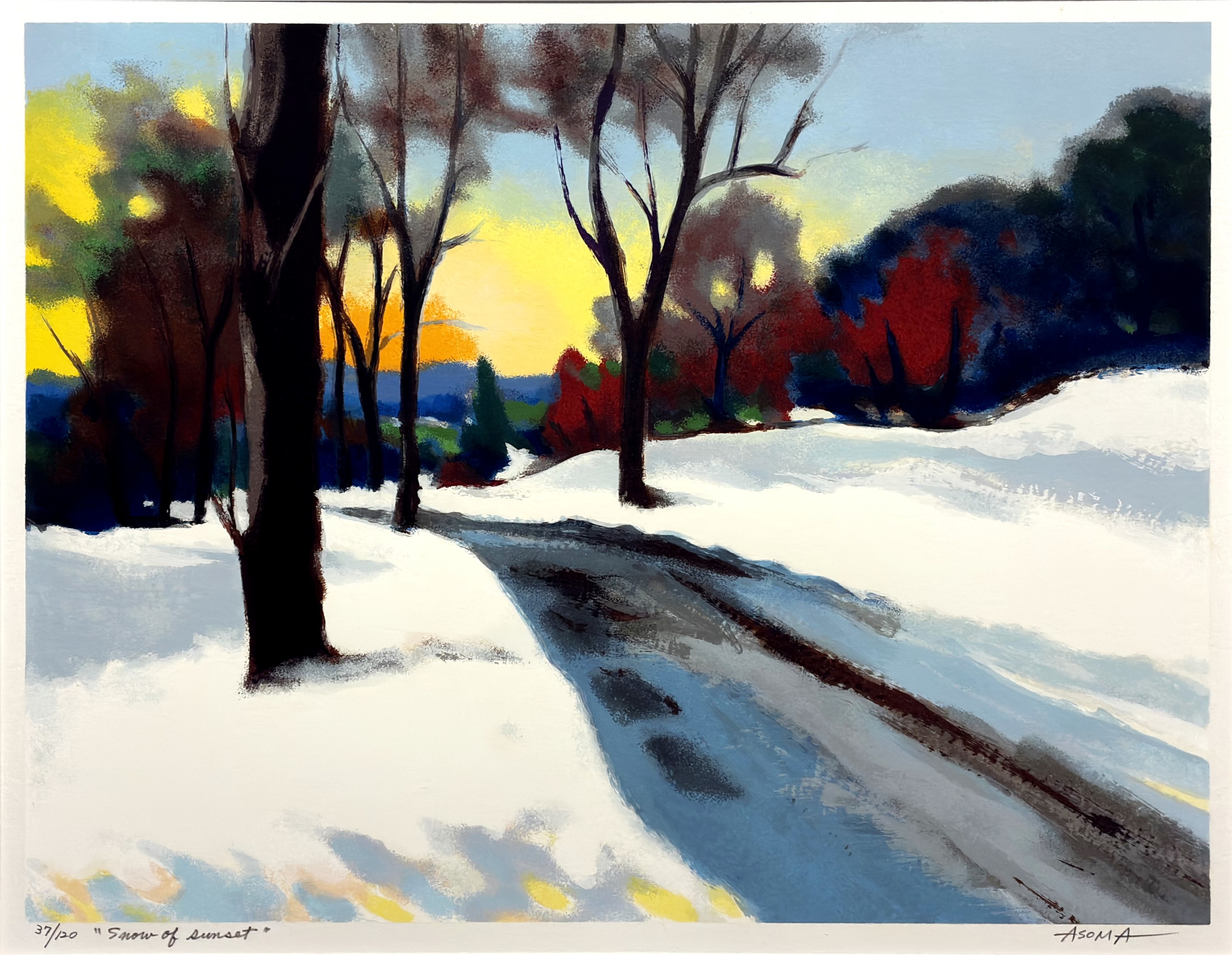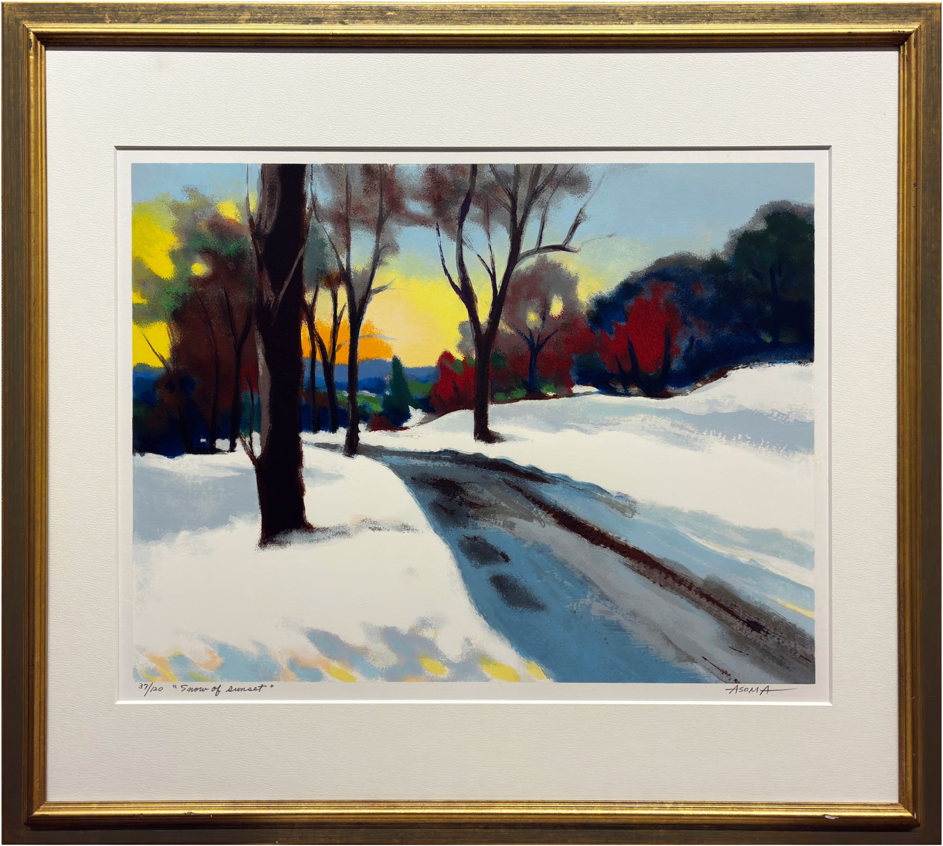本作『Snow of Sunset』は、遊馬正先生が最も得意とするテーマの一つである「雪」と「夕光」を鮮やかに描き出したリトグラフ作品です。