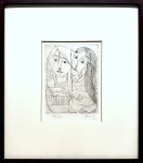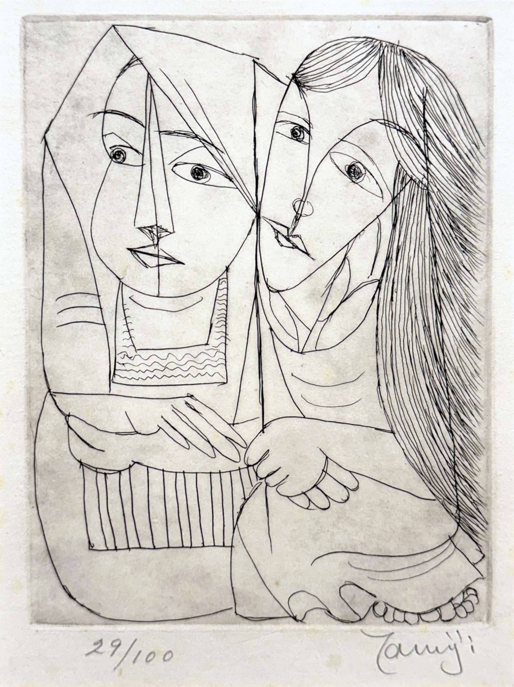 ご覧ください、このミニマルながらも雄弁な描線を。北川は、ピカソに代表されるキュビスムの手法を独自に昇華させ、対象の多面的な本質を一枚の絵の中に描き出しました。正面と横顔が融合したかのような顔立ち、寄り添い、互いの腕が重なり合う構図。これらは単なる様式的な試みではなく、二人の女性の間に流れる、言葉を超えた親密さ、共感、そして共に生きてきた時間の深さを見事に表現しています。