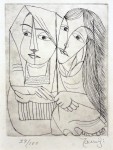左の女性の、民族衣装を思わせる直線的な衣服の模様と、右の女性の流れるように豊かな髪の対比。簡潔な線で描かれながらも、それぞれの個性と内面性が豊かに香り立ちます。その眼差しは、鑑賞者である私たちを静かに見つめ返し、彼女たちの人生の物語を想像させずにはいられません。